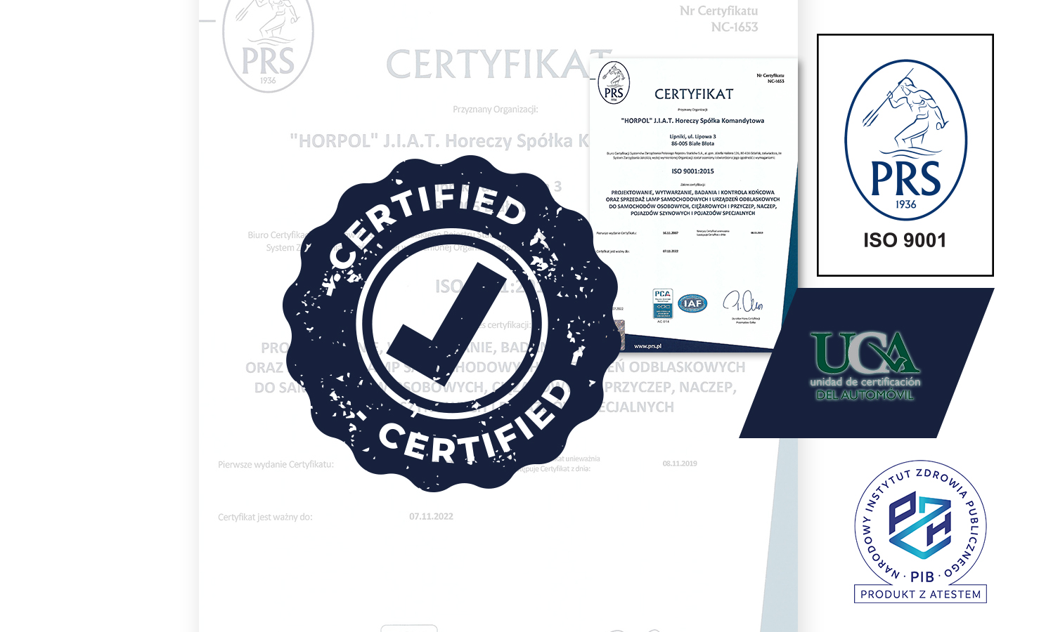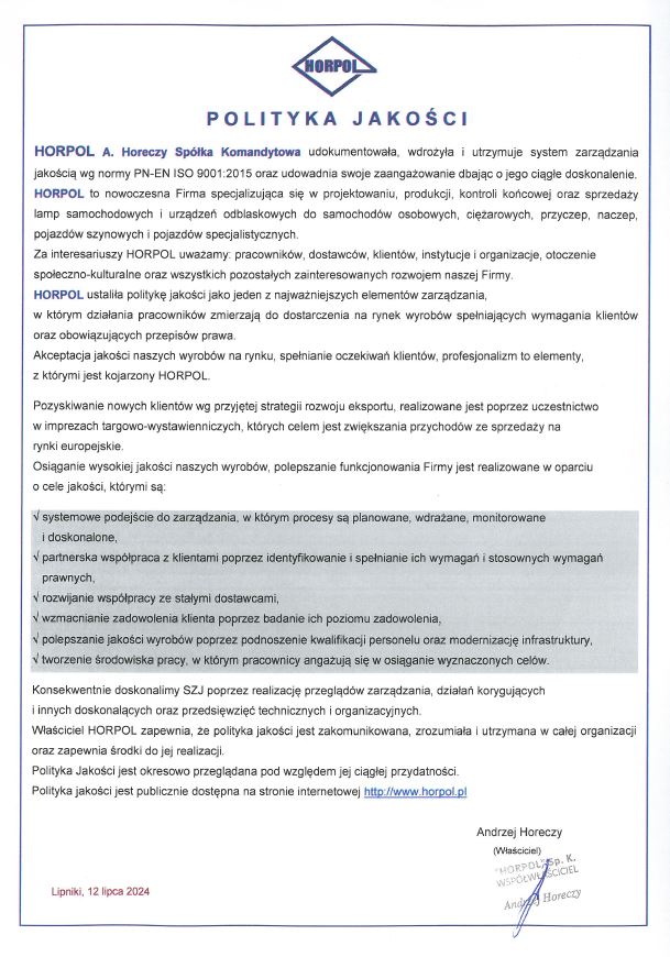 Horpol A. Horeczy Sp. k. to profesjonalna firma specjalizująca się w zakresie produkcji, kontroli i sprzedaży lamp samochodowych oraz urządzeń odblaskowych do wszelkiego rodzaju pojazdów silnikowych. W codziennym działaniu wykorzystujemy nowoczesny system zarządzania jakością zgodny z normą ISO 9001:2015, przy czym dokładamy wszelkich starań, aby stale go poprawiać. Dzięki temu dostarczamy na rynek wysokiej klasy wyroby spełniające oczekiwania konsumentów oraz przepisy prawa.