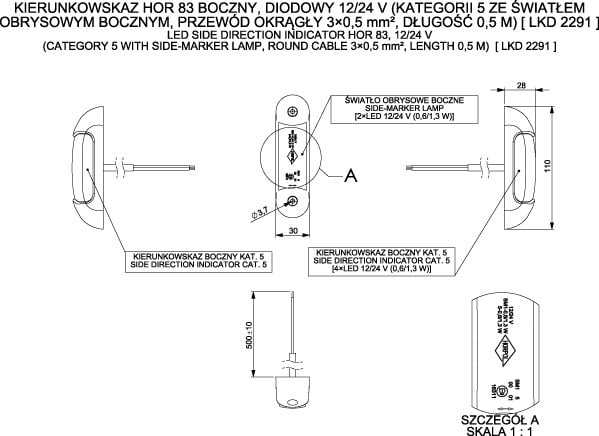 Kierunkowskaz HOR 83 boczny, diodowy 12/24 V (kategorii 5 ze światłem obrysowym bocznym)