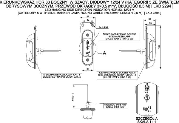 Kierunkowskaz HOR 83 boczny, wiszący, diodowy 12/24 V (kategorii 5 ze światłem obrysowym bocznym)