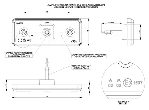 Lampa obrysowa prostokątna z odblaskiem, biała z podkładką gumową z rantem.