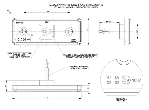 Lampa obrysowa prostokątna z odblaskiem, czerwona z podkładką gumową z rantem