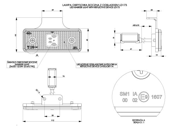 Lampa obrysowa prostokątna z odblaskiem, pomarańczowa z wieszakiem i zaciskiem.