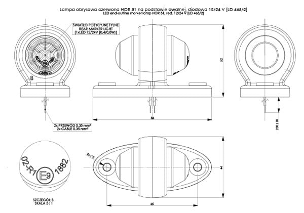 Lampa obrysowa czerwona HOR 51 na podstawie owalnej, diodowa 12/24V