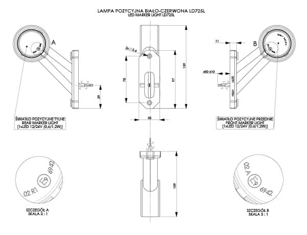 Lampa obrysowa biało-czerwona, na wysięgniku krótkim ukośnym.