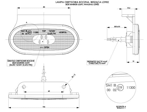 Lampa obrysowa boczna owalna z odblaskiem HOR 59, wisząca, diodowa 12/24V