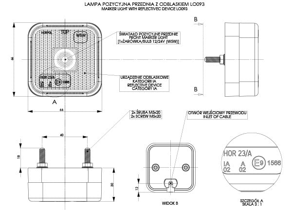 Lampa obrysowa kwadratowa z odblaskiem, biała