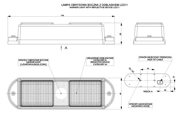 Lampa obrysowa prostokątna z odblaskiem, pomarańczowa