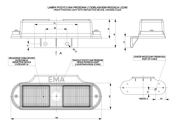 Lampa obrysowa prostokątna z odblaskiem – podwieszana, biała