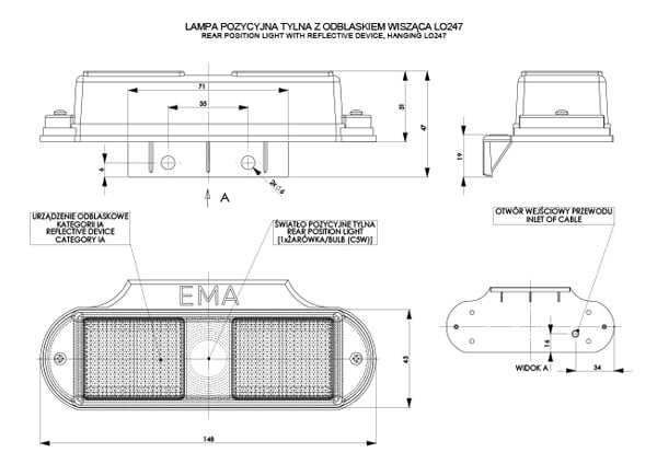 Lampa obrysowa prostokątna z odblaskiem – podwieszana, czerwona