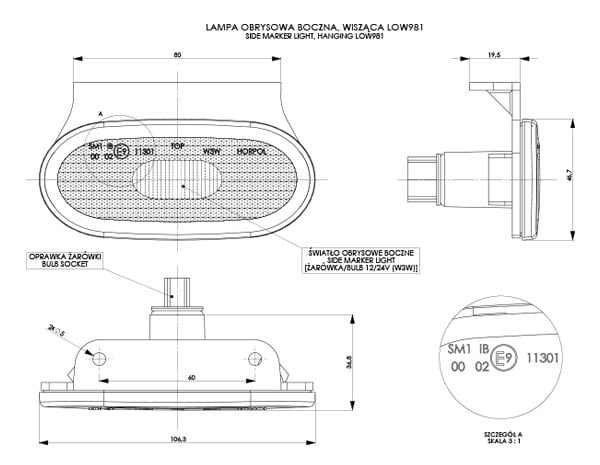 Lampa obrysowa boczna owalna z odblaskiem HOR 59, wisząca Dostępne kolory: pomarańczowy