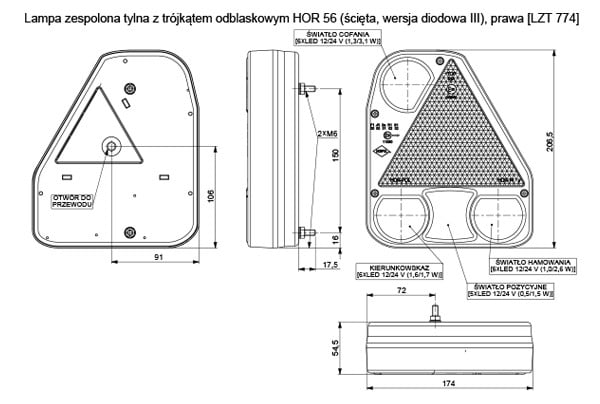 Lampa zespolona tylna z trójkątem odblaskowym HOR 56 (narożna, wersja diodowa III), prawa.