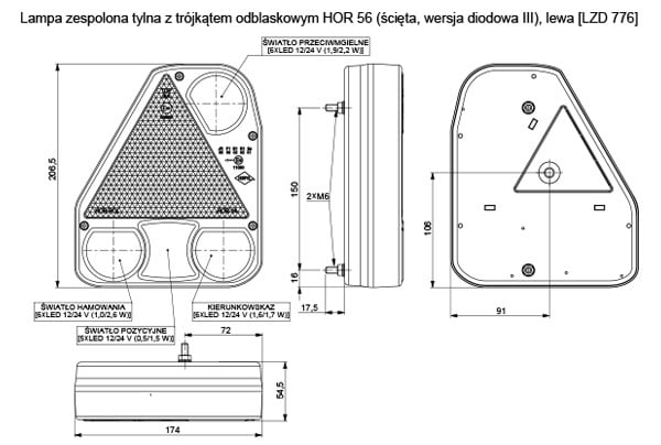 Lampa zespolona tylna z trójkątem odblaskowym HOR 56 (narożna, wersja diodowa III), lewa.