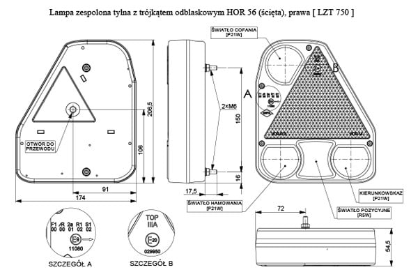 Lampa zespolona tylna z trójkątem odblaskowym HOR 56, narożna, prawa