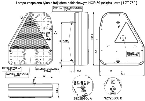 Lampa zespolona tylna z trójkątem odblaskowym HOR 56, narożna, lewa