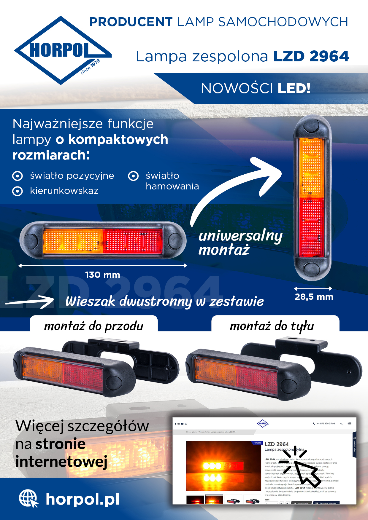 LZD 2964 jest diodową tylną lampą zespoloną o kompaktowych rozmiarach. Ten model z powodzeniem znajdzie swoje zastosowanie w takich pojazdach jak maszyny rolnicze, budowlane, quady, przyczepki, oraz jako lampy powtórzeniowe w lawetach, samochodach ciężarowych, pojazdach specjalistycznych. Pomimo małych pól świecących lampa emituje wyraźne światła i spełnia najważniejsze funkcje: pozycyjna, kierunkowskaz, hamowania. Lampa posiada homologacje świetlną oraz kompatybilności elektromagnetycznej (EMC). LZD 2964 można montować w pionie i w poziomie, bezpośrednio do powierzchni płaskiej, jak i za pomocą wieszaka w standardzie.