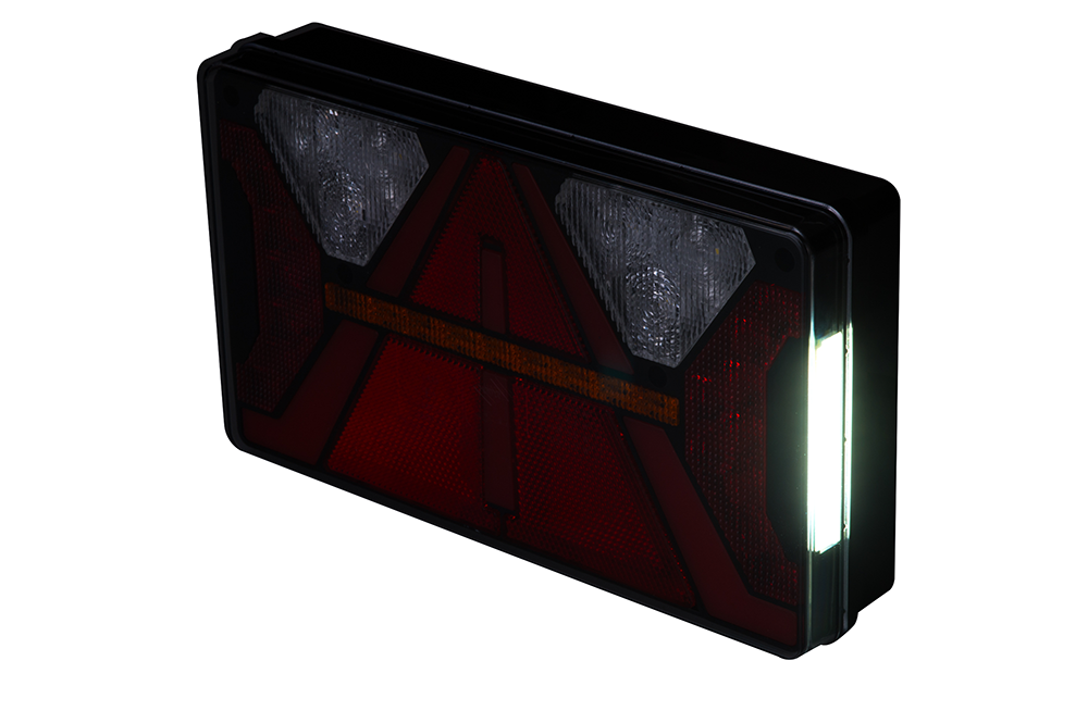 Nowoczesna tylna lampa zespolona STRADA LZD 2820 (lewa) należy do grupy produktowej HOR 124, zawiera 71 diod LED i wymaga uniwersalnego napięcia zasilającego 12/24 V. Lampa łączy w sobie wszystkie ważne funkcje oświetleniowe występujące z tyłu pojazdów dostawczych, jak i na przyczepach, lawetach oraz naczepach rolniczych. Są to: światło pozycyjne tylne NEON (2,2/5,5 W), światło hamowania (2,8/3,6 W), światło cofania (2,2/6,4 W), światło przeciwmgielne (4,8/5,5 W), kierunkowskaz tylny (1,7/2,4 W), oświetlenie tablicy rejestracyjnej (0,5/1,2 W) oraz trójkąt odblaskowy.