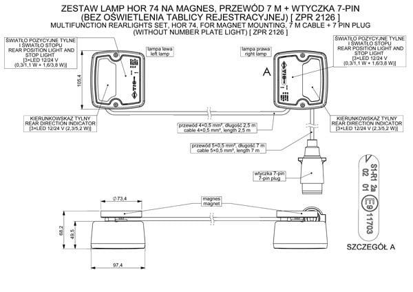 Zestaw lamp HOR 74 na magnes, przewód 7 m + wtyczka 7-pin 12 V (bez oświetlenia tablicy rejestracyjnej)
