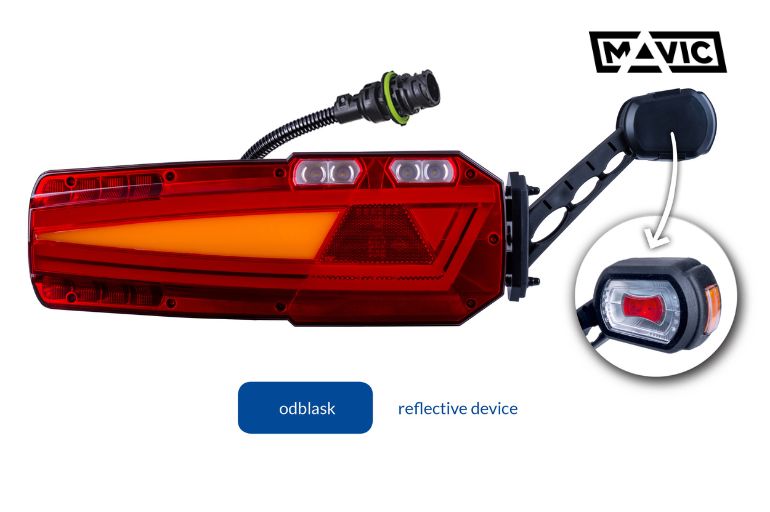 W naszej ofercie posiadamy również lampy zespolone MAVIC z trójkątem odblaskowym i lampą obrysową na wysięgniku LZD 3049/H101/AMP (lewa), LZD 3050/H101/AMP (prawa).