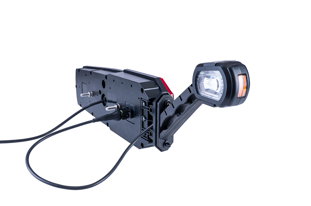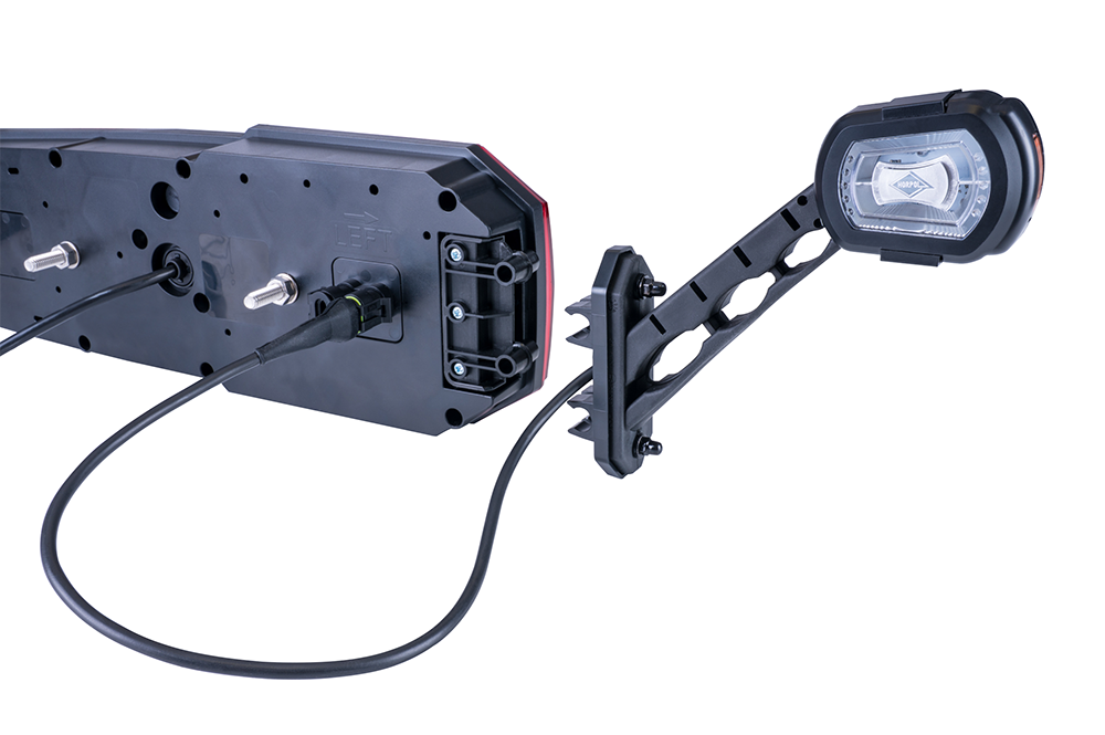 – Dzięki podwójnemu gniazdu Superseal w korpusie lampy zespolonej istnieje możliwość prostego podłączenia zintegrowanej lampy obrysowej na wysięgniku oraz oświetlenia tablicy rejestracyjnej w pojeździe lub wiązki zasilającej lampy obrysowe.